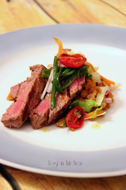 Grigliare le fette di filetto su una piastra rovente, lasciandole ben rosee (o rosse) all'interno. Affettarle come per una tagliata e poggiarle sull'insalata, completando con un filo di emulsione e un po' di sale.